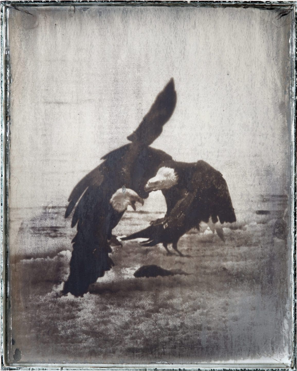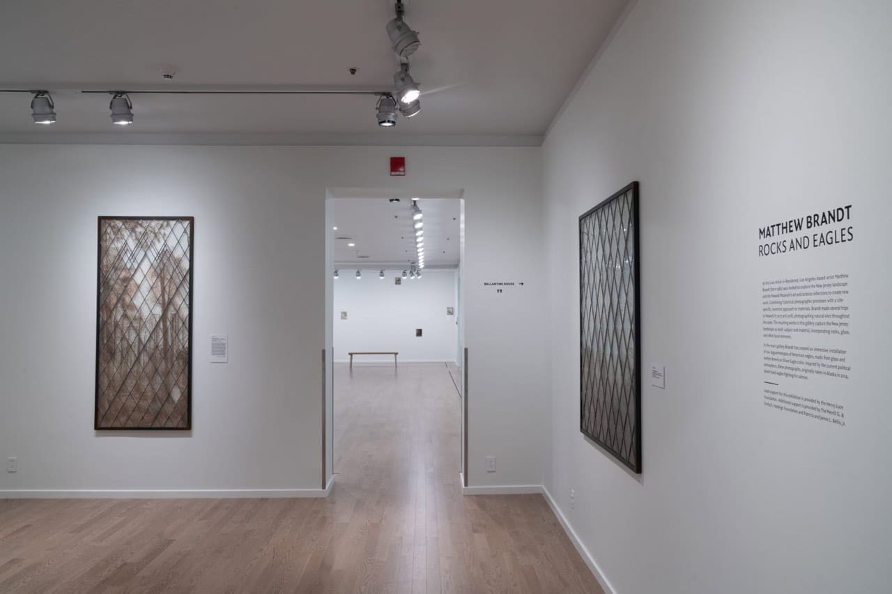 Brandt, who lives and works in Los Angeles, made several trips to Newark in 2017 and 2018, photographing natural sites throughout the state and engaging with the Museum’s art and science collections. The resulting large-scale works capture the New Jersey landscape as both subject and material, incorporating rocks, glass, and other local elements. In the main gallery, Brandt created an immersive installation of 100 daguerreotypes of eagles, inspired by the current political atmosphere. These photographs, originally taken in Alaska in 2014, depict American bald eagles fighting for salmon and are made with melted American Silver Eagle coins and glass.
