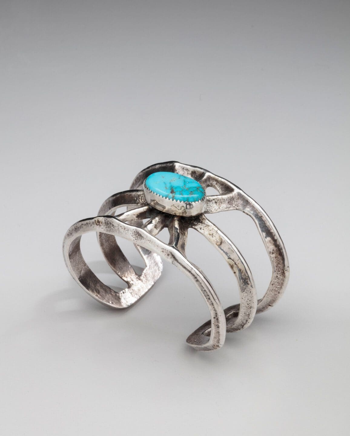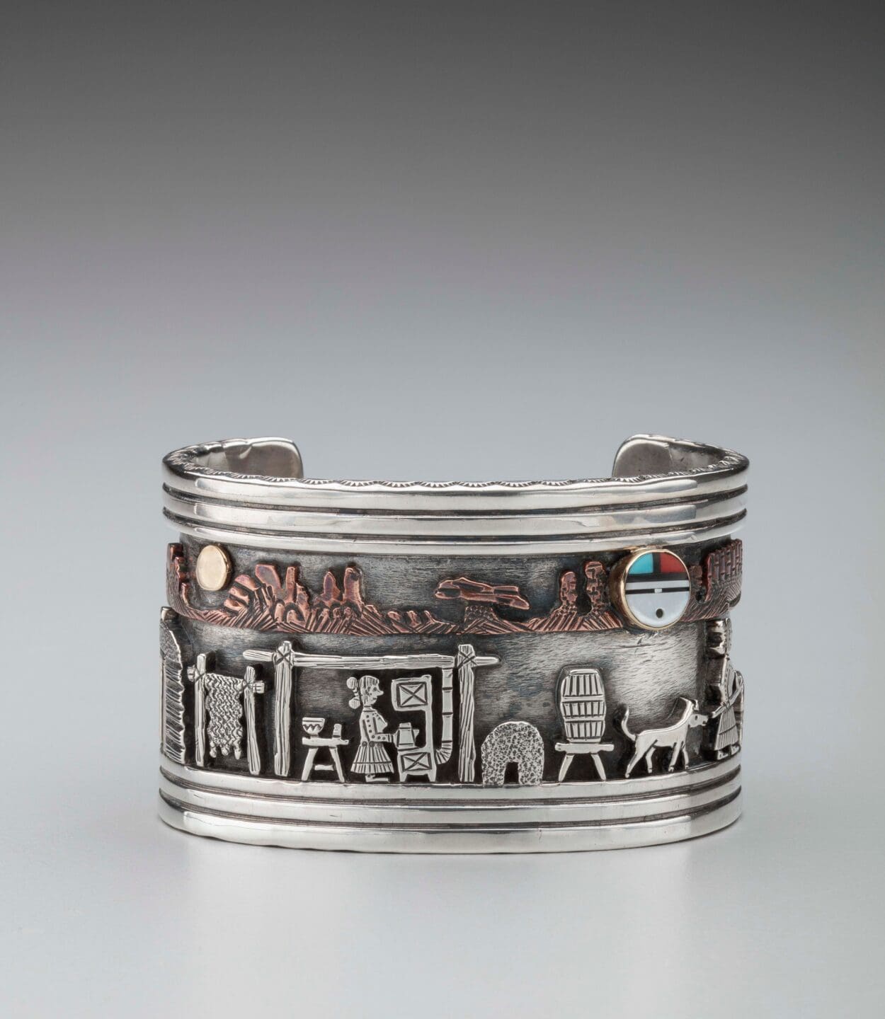Since the mid-20th century, there has been an explosion of creativity and experimentation. Recognized internationally as innovators of Modern jewelry design between the 1950s and 1970s, Preston Monongye, Kenneth Begay, and Charles Loloma created artworks with bold patterns and outstanding craftsmanship. They redefined how silver, turquoise, and gemstones could convey Hopi and Navajo aesthetics and introduced new approaches for high fashion. The next generations of innovators, including those shown here, have continued to experiment with new materials and reimagined traditional forms.